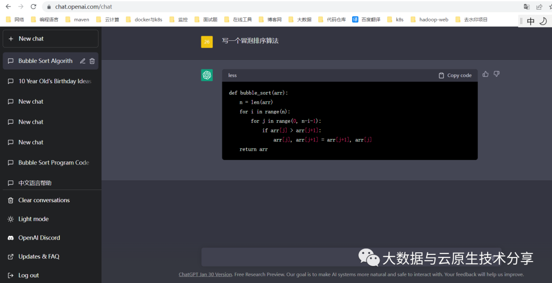 到此ChatGPT快速使用和注册的全过程就先到这里了,有疑问的小伙伴欢迎给我留言,也可关注我公众号【大数据与云原生技术分享】进行技术交流~