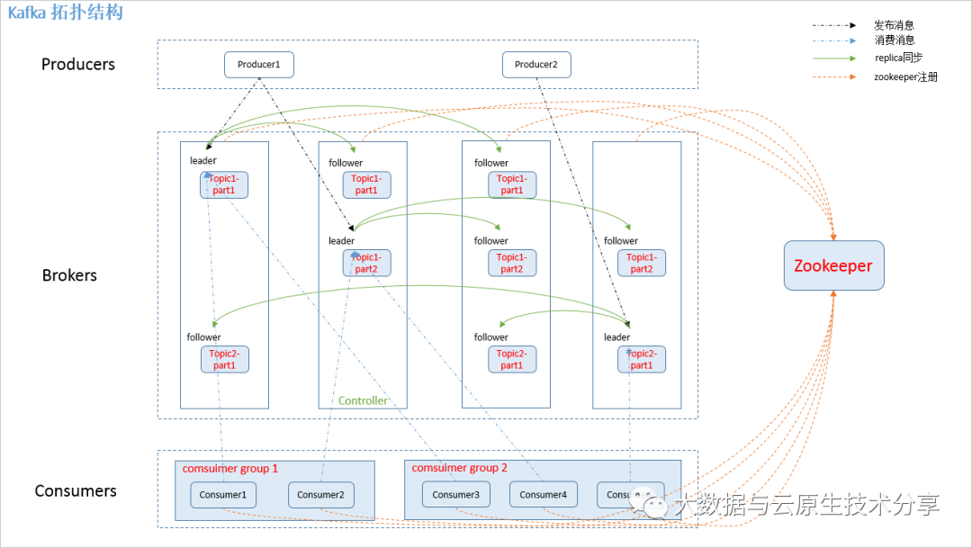 Controller:kafka在所有broker中选出一个controller leader,所有Partition的Leader选举都由controller决定。controller leader也负责管理整个集群中分区和副本的状态,比如partition的leader 副本故障,由controller 负责为该partition重新选举新的leader 副本;当检测到ISR列表发生变化,有controller通知集群中所有broker更新其MetadataCache信息;或者增加某个topic分区的时候也会由controller管理分区的重新分配工作。