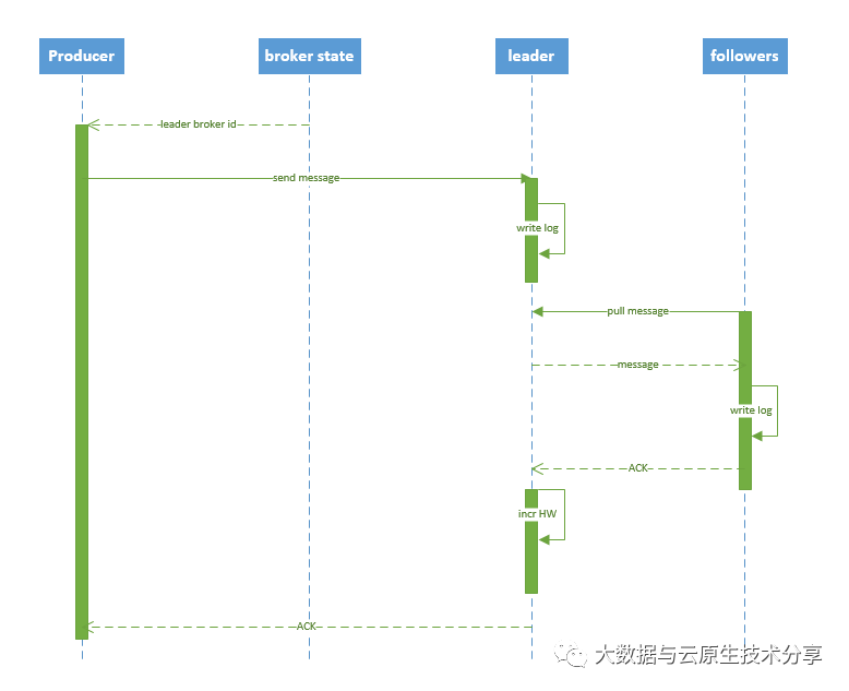 leader 收到所有 ISR 中的 replica 的 ACK 后,增加 HW(high watermark,最后 commit 的 offset) 并向 producer 发送 ACK