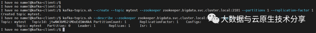 $ kafka-topics.sh --create --topic mytest --zookeeper zookeeper.bigdata.svc.cluster.local:2181 --partitions 1 --replication-factor 1