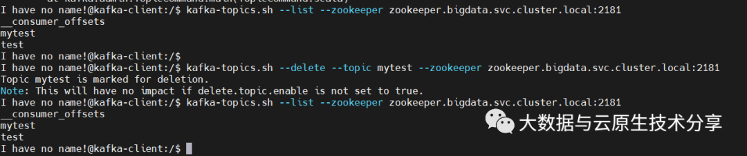 $ kafka-topics.sh --delete --topic mytest --zookeeper zookeeper.bigdata.svc.cluster.local:2181