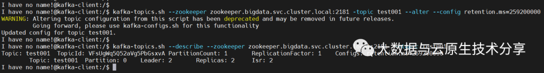 $ kafka-topics.sh --zookeeper zookeeper.bigdata.svc.cluster.local:2181 -topic test001 --alter --config retention.ms=259200000