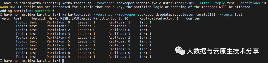 $ kafka-topics.sh --zookeeper zookeeper.bigdata.svc.cluster.local:2181 --alter --topic test --partitions 10