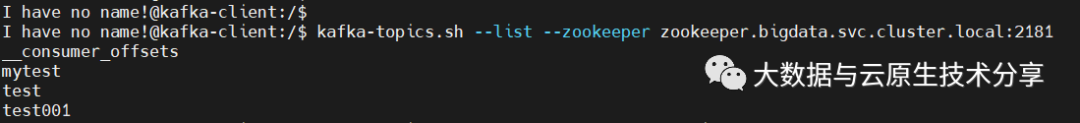 $ kafka-topics.sh --list --zookeeper zookeeper.bigdata.svc.cluster.local:2181