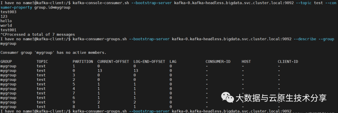 $ kafka-console-consumer.sh --bootstrap-server kafka-0.kafka-headless.bigdata.svc.cluster.local:9092 --topic test --consumer-property group.id=mygroup