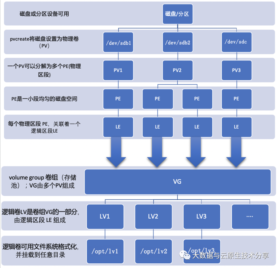 逻辑块LE(Logical Extent):逻辑卷LV中可以分配的最小存储单元,在同一卷组VG中LE的大小和PE是相同的,并且一一相对。