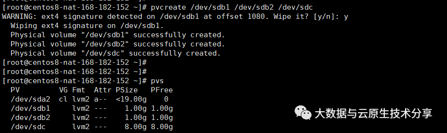 $ pvcreate dev/sdb1 dev/sdb2 dev/sdc