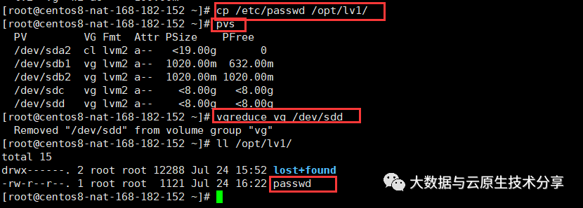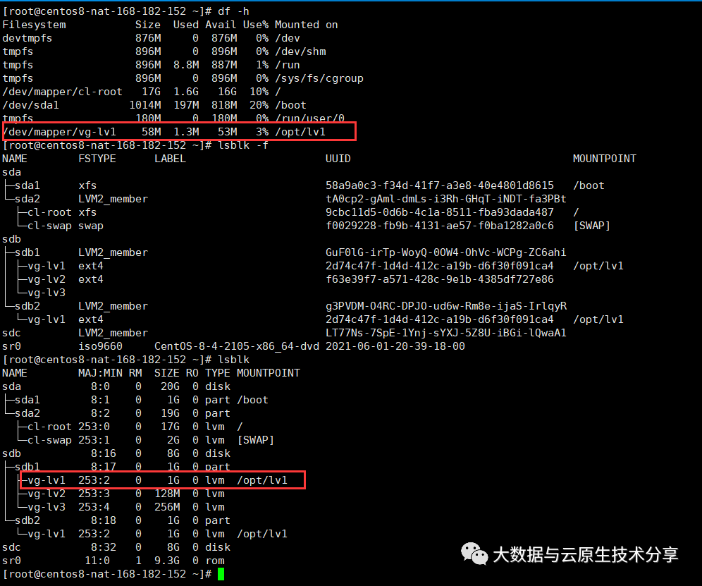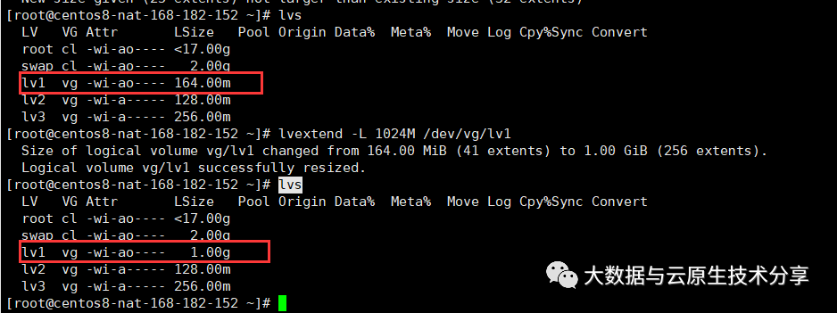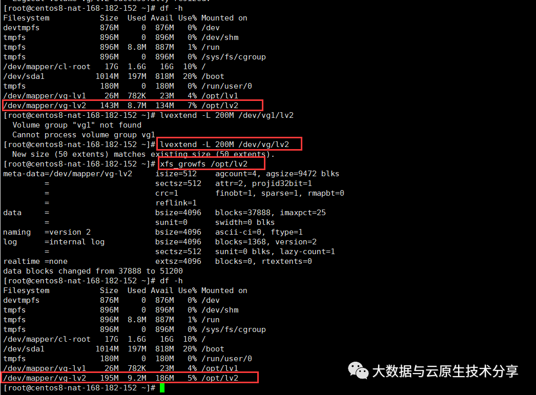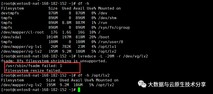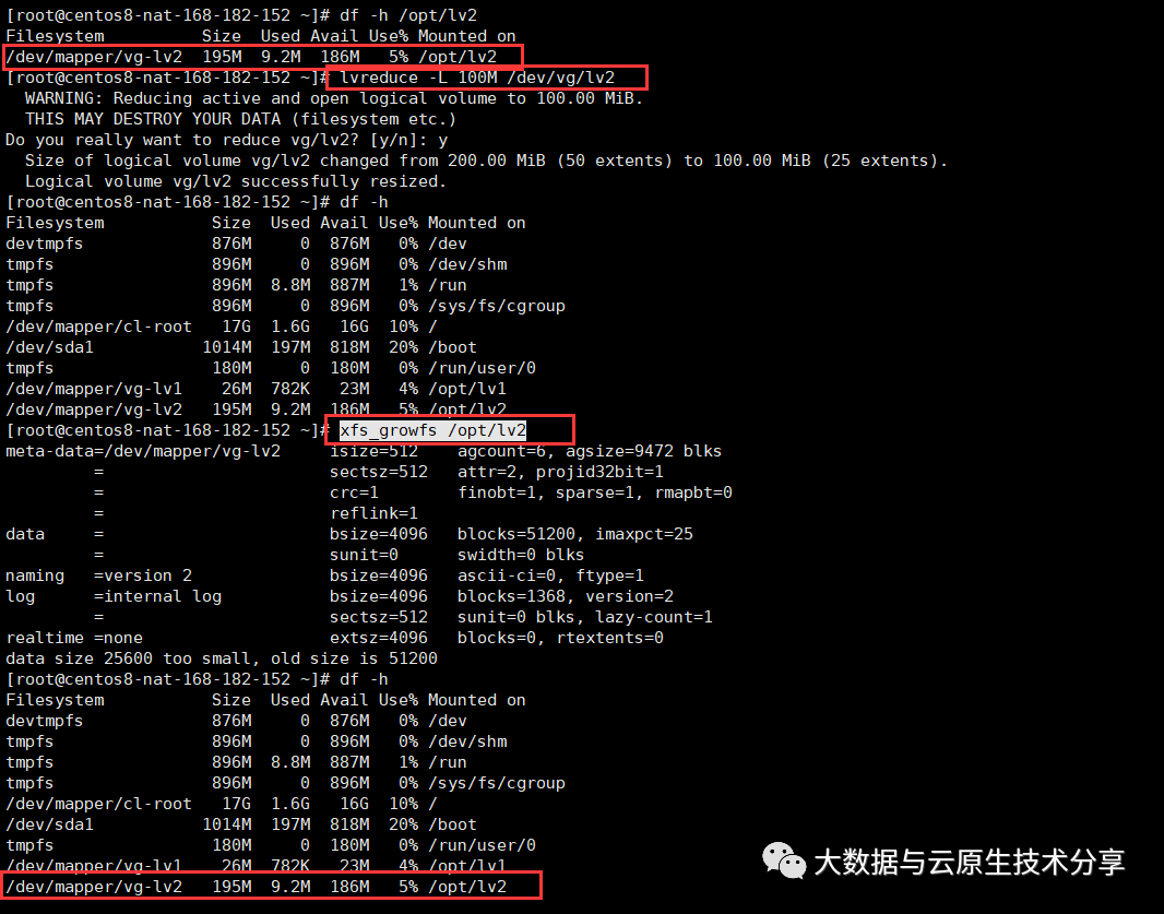 再试试lvreduce和xfs_growfs组合能不能动态减少空间。这里为什么说动态呢?因为xfs_groefs必须是挂载情况下才能使用,后面跟的是挂载点。