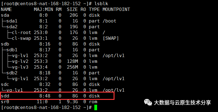 物理存储介质(The physical media):LVM存储介质,可以是硬盘分区、整个硬盘、raid阵列或SAN硬盘。设备必须初始化为LVM物理卷,才能与LVM结合使用。