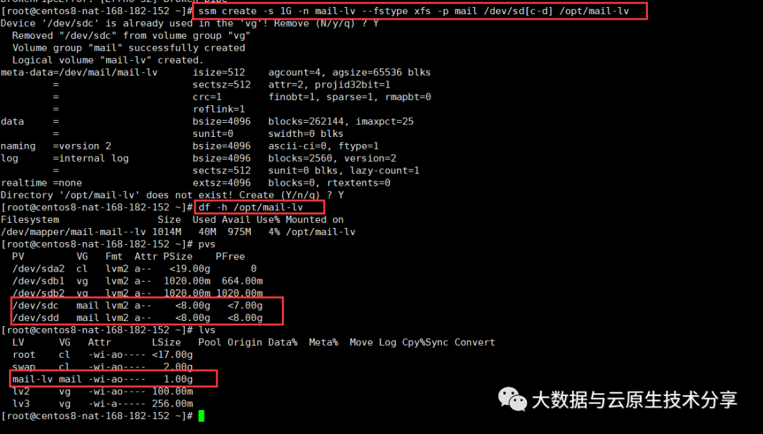 $ ssm create -s 1G -n mail-lv --fstype xfs -p mail /dev/sd[c-d] /opt/mail-lv
