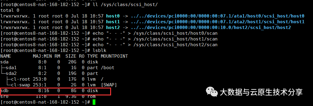 $ echo "- - -" > sys/class/scsi_host/host0/scan