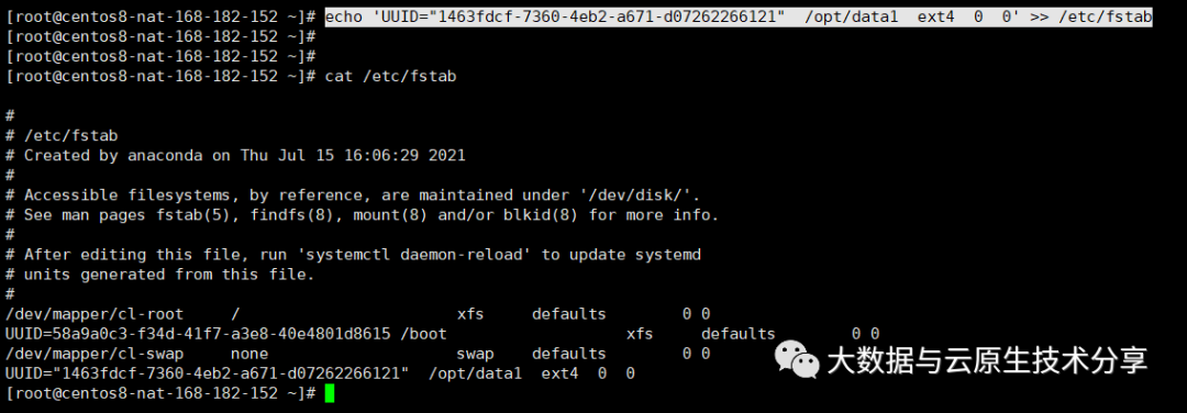 $ echo 'UUID="1463fdcf-7360-4eb2-a671-d07262266121" /opt/data1 ext4 defaults 0 0' >> /etc/fstab