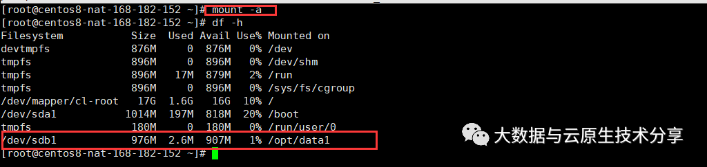 由于内核还没有读取这个命令,使用mount -a 这个命令来让内核读取这个文件(通过mount -a 读取/etc/fstab 重新挂载)