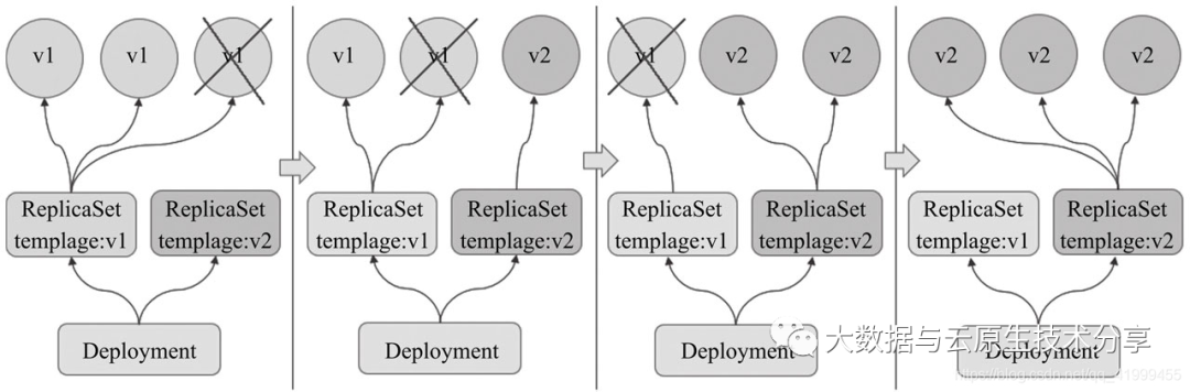 Deployment控制器的滚动更新操作并非在同一个ReplicaSet控制器对象下删除并创建Pod资源,而是将它们分置于两个不同的控制器之下:旧控制器的Pod对象数量不断减少的同时,新控制器的Pod对象数量不断增加,直到旧控制器不再拥有Pod对象,而新控制器的副本数量变得完全符合期望值为止,如图所示: