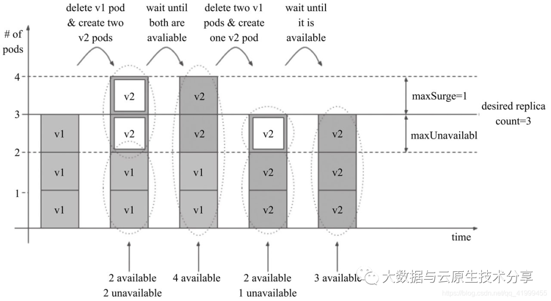 maxUnavailable:升级期间正常可用的Pod副本数(包括新旧版本)最多不能低于期望数值的个数,其值可以是0或正整数,也可以是一个期望值的百分比;默认值为1,该值意味着如果期望值是3,则升级期间至少要有两个Pod对象处于正常提供服务的状态。