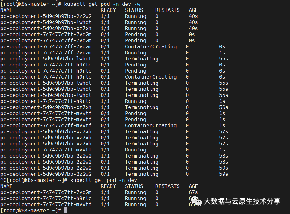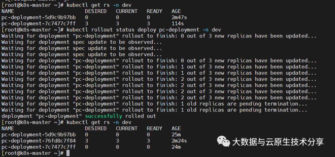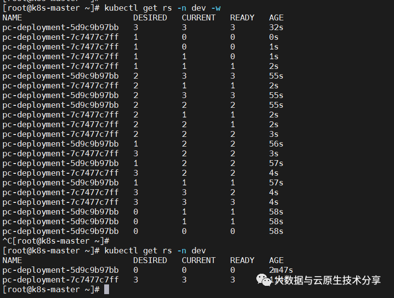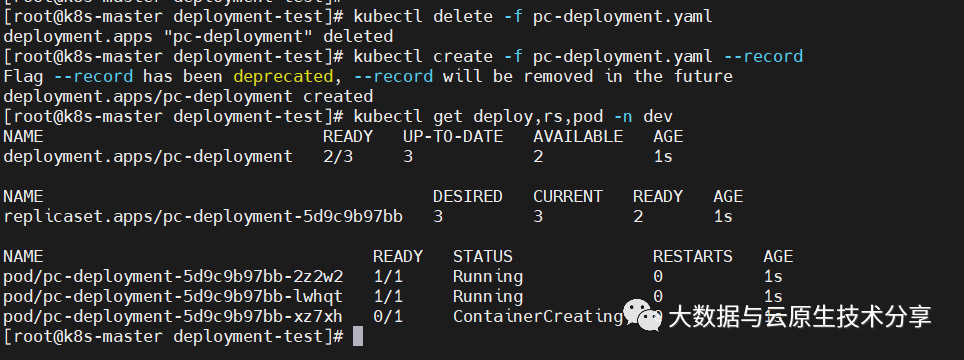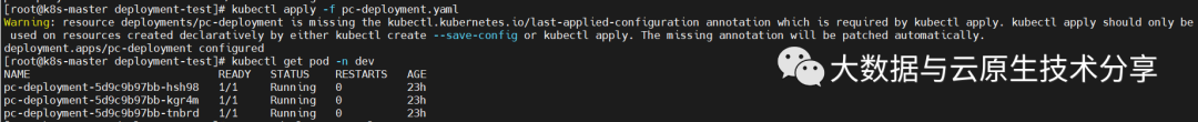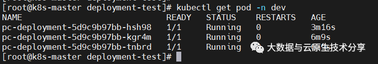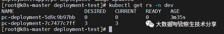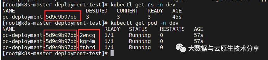 查看deployment控制的rs和pod,发现rs是在deployment之后加了一段字符串,而pod是在rs之后加了一段字符串。