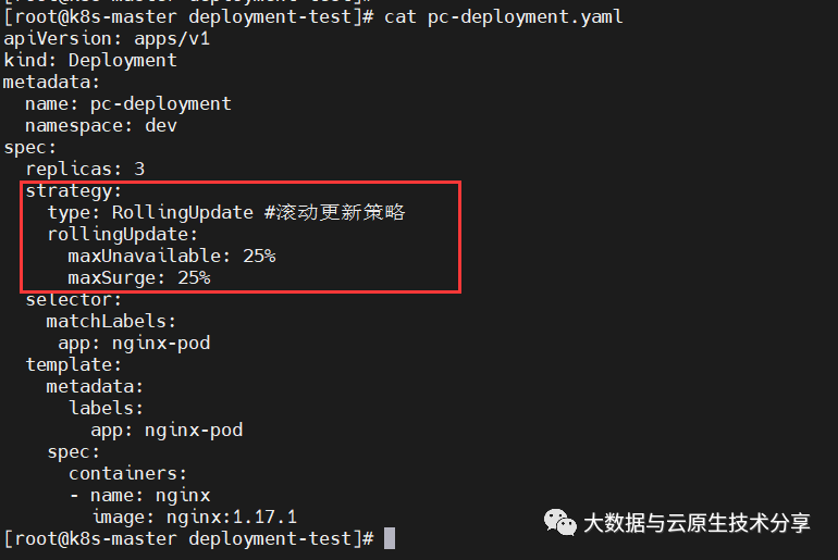 编辑pc-deployment.yaml,在spec节点下添加滚动更新策略(也可以把strategy去掉,因为默认滚动更新策略)