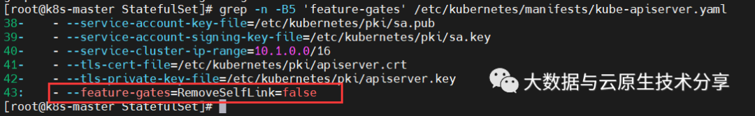 修改 etc/kubernetes/manifests/kube-apiserver.yaml 文件,并在其启动参数中增加一行 – –feature-gates=RemoveSelfLink=false,如下第 43行所示:
