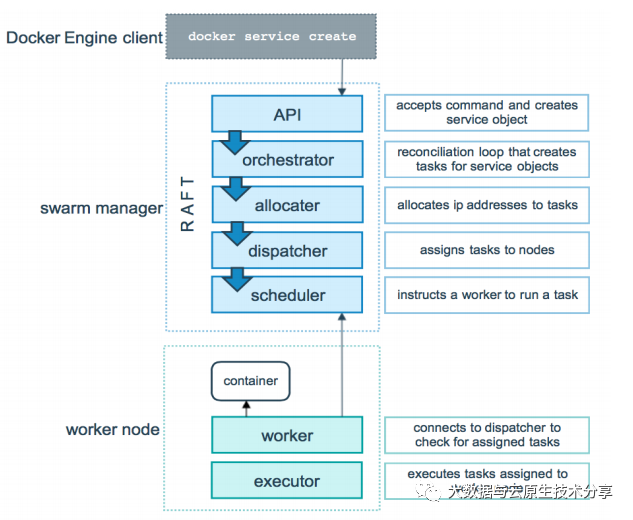 API:这个请求直接由Swarm manager的API进行接收,接收命令并创建服务对象。