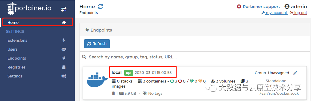 由于portainer支持local、remote、agent等形式来管理docker容器。我们这里是为了管理本地的docker容器,所以选择第一个local。