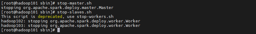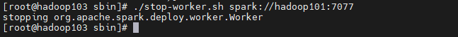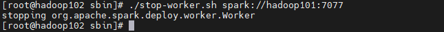 #关闭主节点--hadoop101上执行stop-master.sh#关闭从节点--all--hadoop101上执行stop-slaves.sh重定向到了 stop-workers.sh#关闭从节点--single--分别在对应的服务器上执行关闭命令格式:sh stop-worker.sh master-url:7077备注:此例master 主机名为 hadoop101【示例】:#在hadoop102、hadoop103上面分别执行下面命令启动该节点上work./stop-worker.sh spark://hadoop101:7077