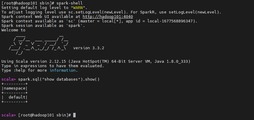 spark-shellspark.sql("show databases").show()退出:ctrl+c