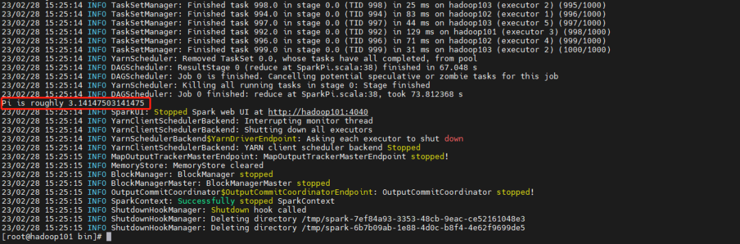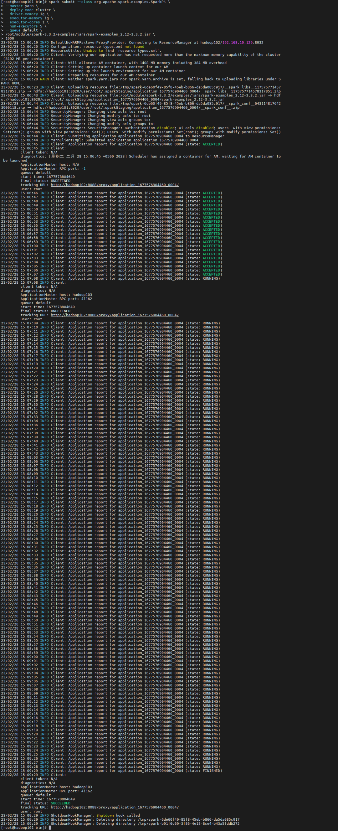 spark-submit --class org.apache.spark.examples.SparkPi \--master yarn \--deploy-mode cluster \--driver-memory 1g \--executor-memory 1g \--executor-cores 1 \--num-executors 5 \--queue default \/opt/module/spark-3.3.2/examples/jars/spark-examples_2.12-3.3.2.jar \1000