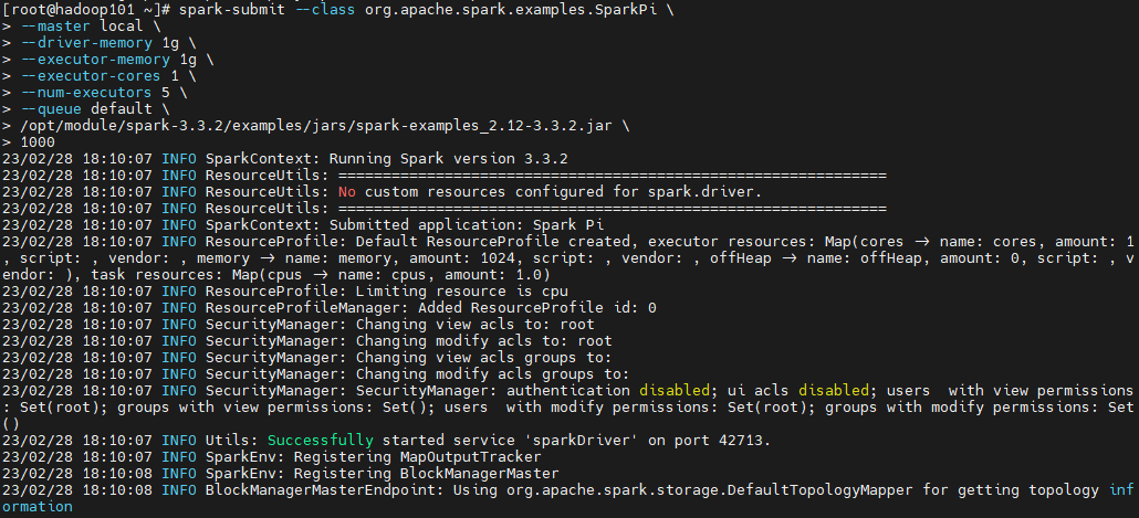 spark-submit --class org.apache.spark.examples.SparkPi \--master local \--driver-memory 1g \--executor-memory 1g \--executor-cores 1 \--num-executors 5 \--queue default \/opt/module/spark-3.3.2/examples/jars/spark-examples_2.12-3.3.2.jar \1000