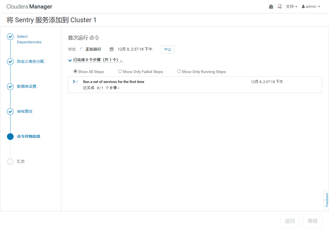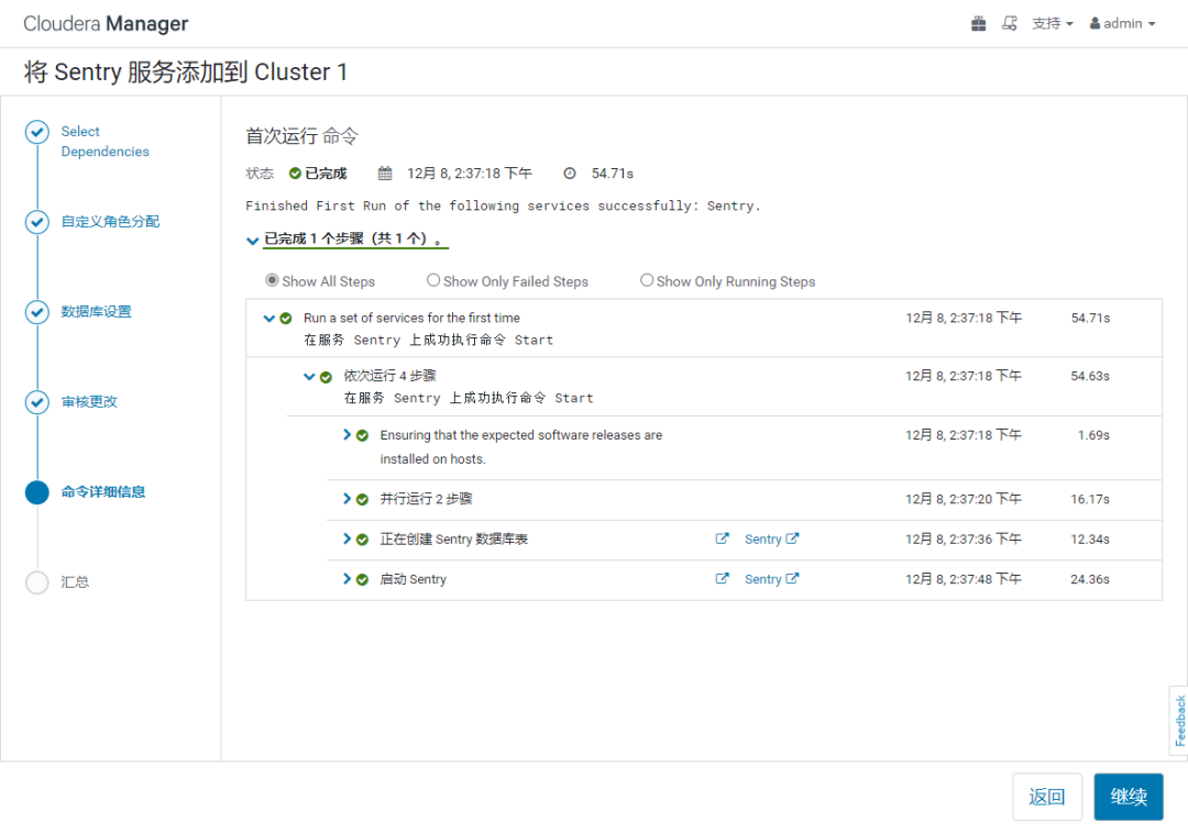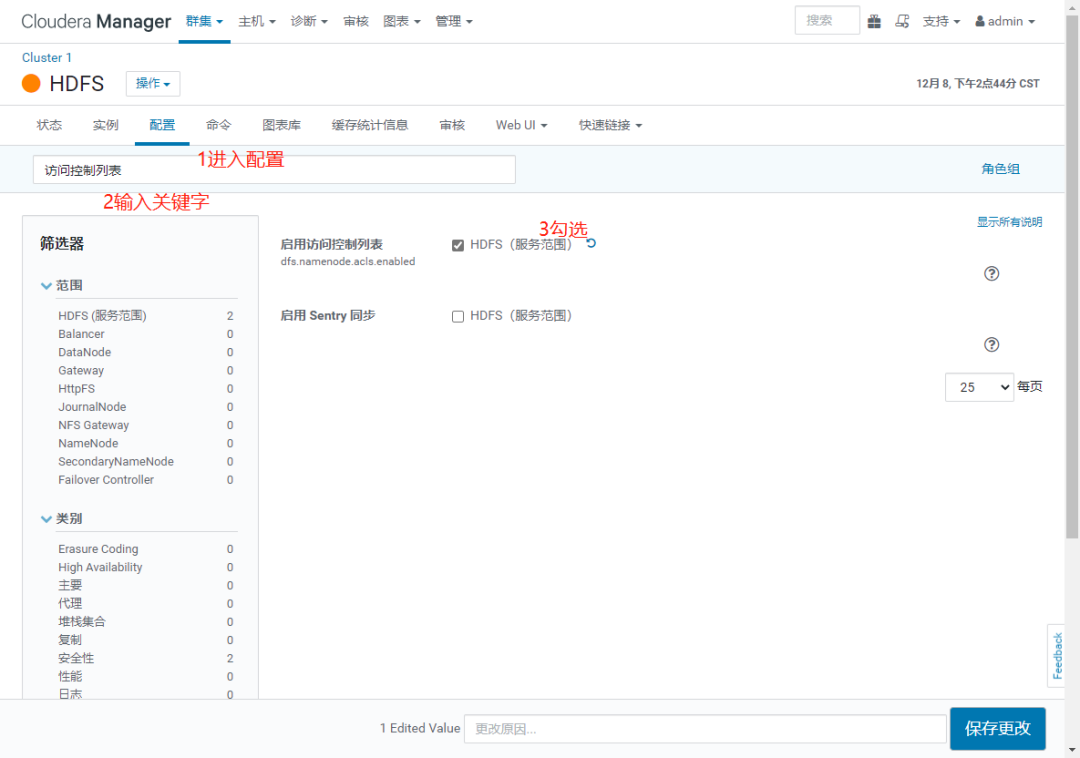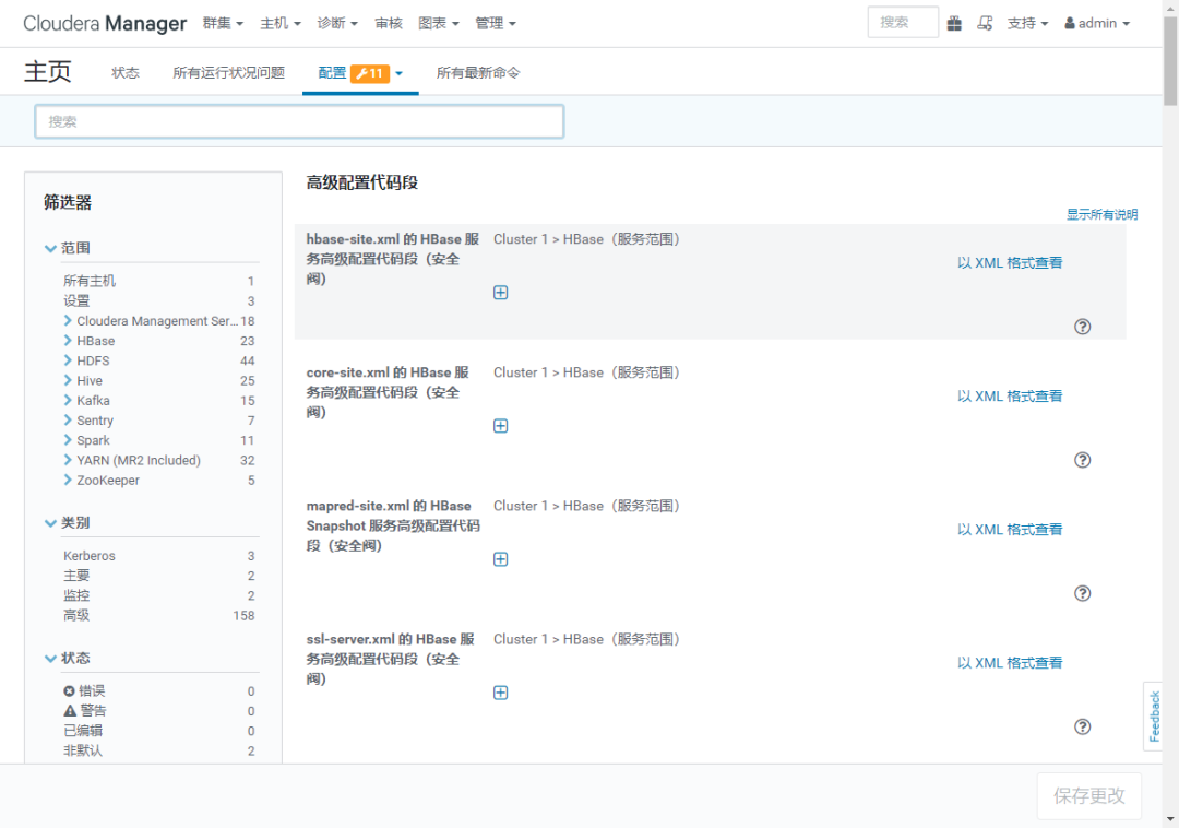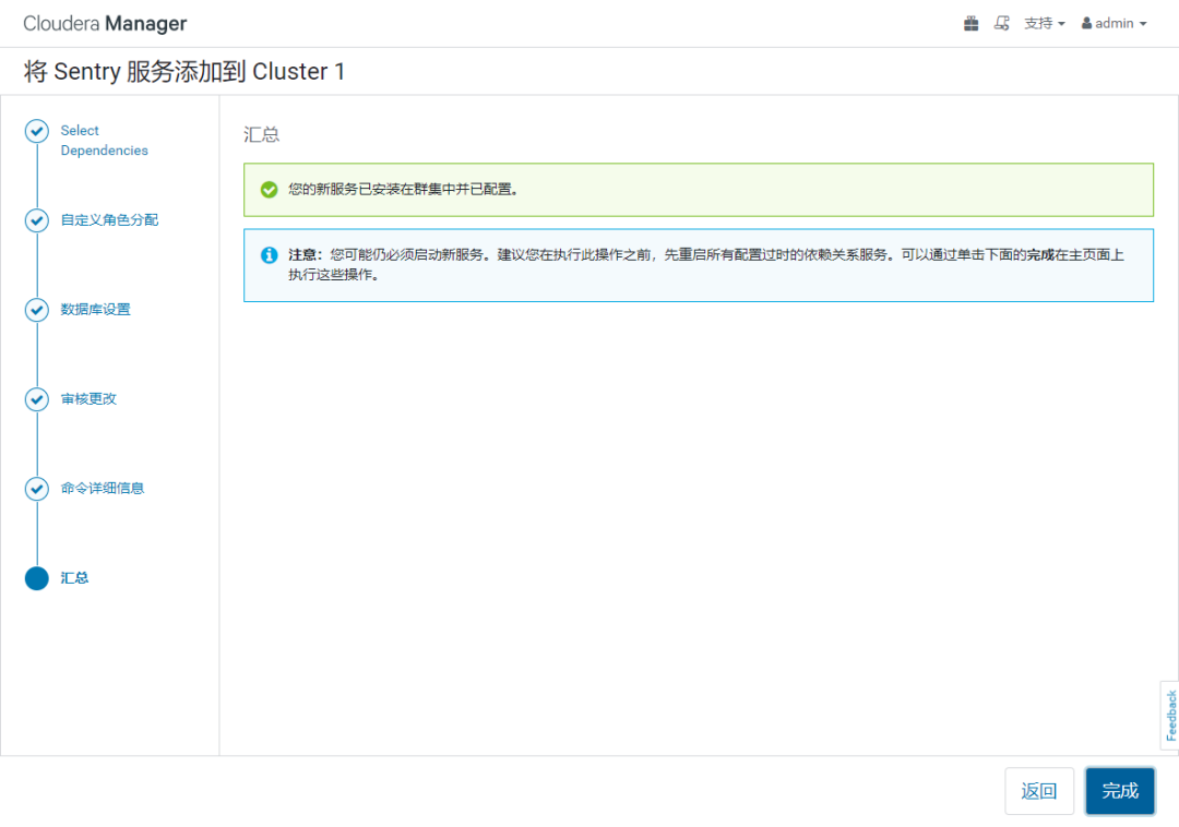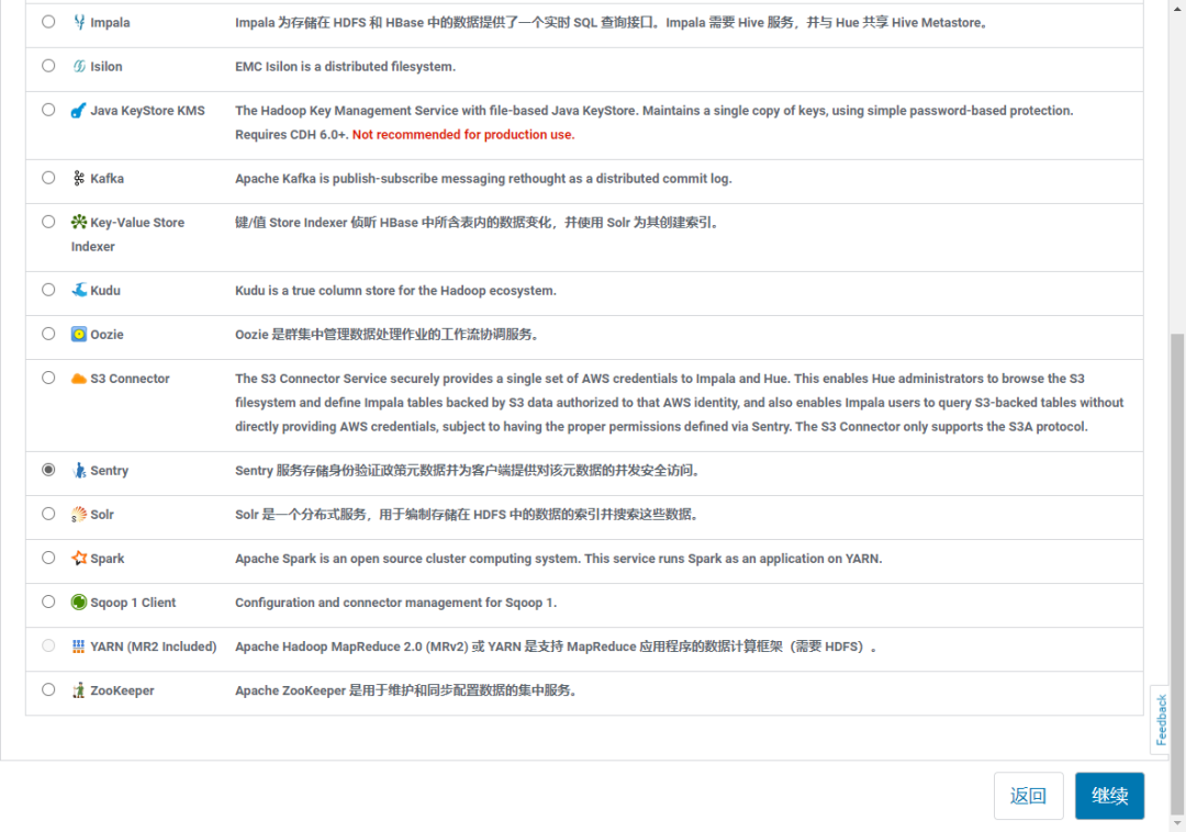 【备注】:如果不按照本文顺序可能会报一些依赖关系的错误。如下:如果提示 "启用 HDFS/Sentry 同步时,必须正好有一个依赖 Sentry 的 Hive 服务,但是存在 0 个依赖性 Hive 服务" 表示 hive 组件需要启用 "Sentry" 权限控制,即 在 hive 组件,选 "Sentry 服务"=Sentry ( 默认为 none )