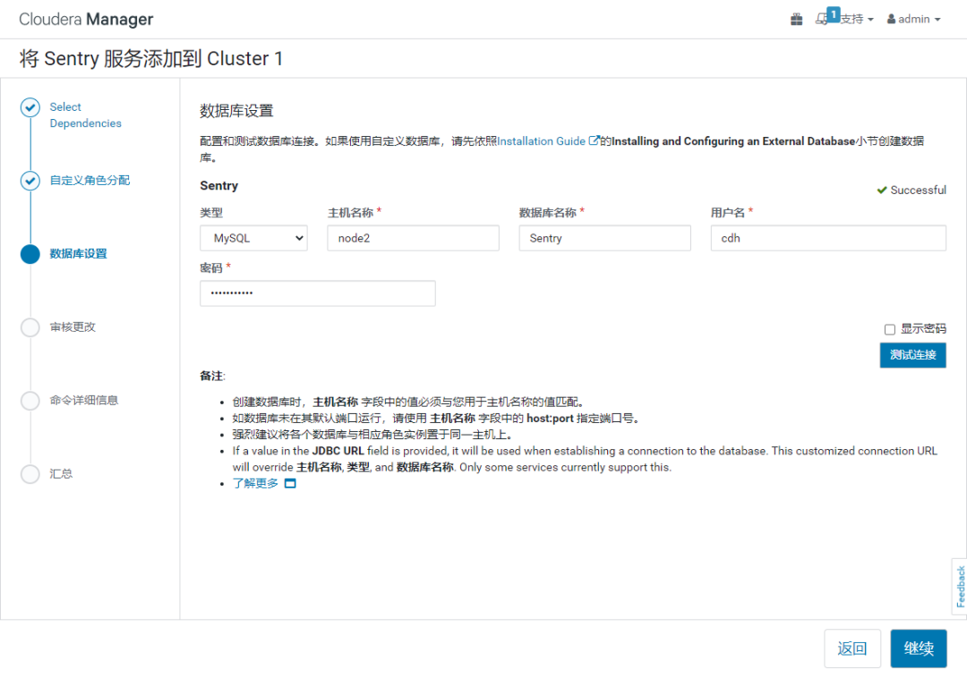 在node2 服务器(cdh 元数据库mysql服务器)上需要提前创建好Sentry 元数据库