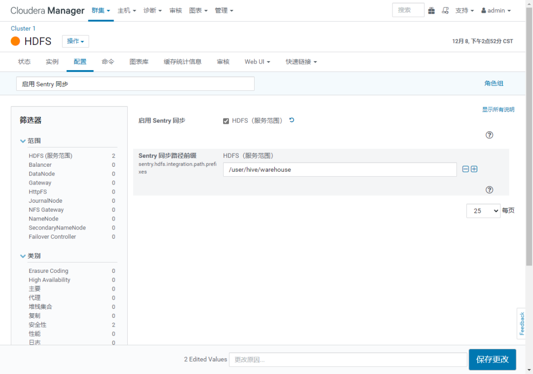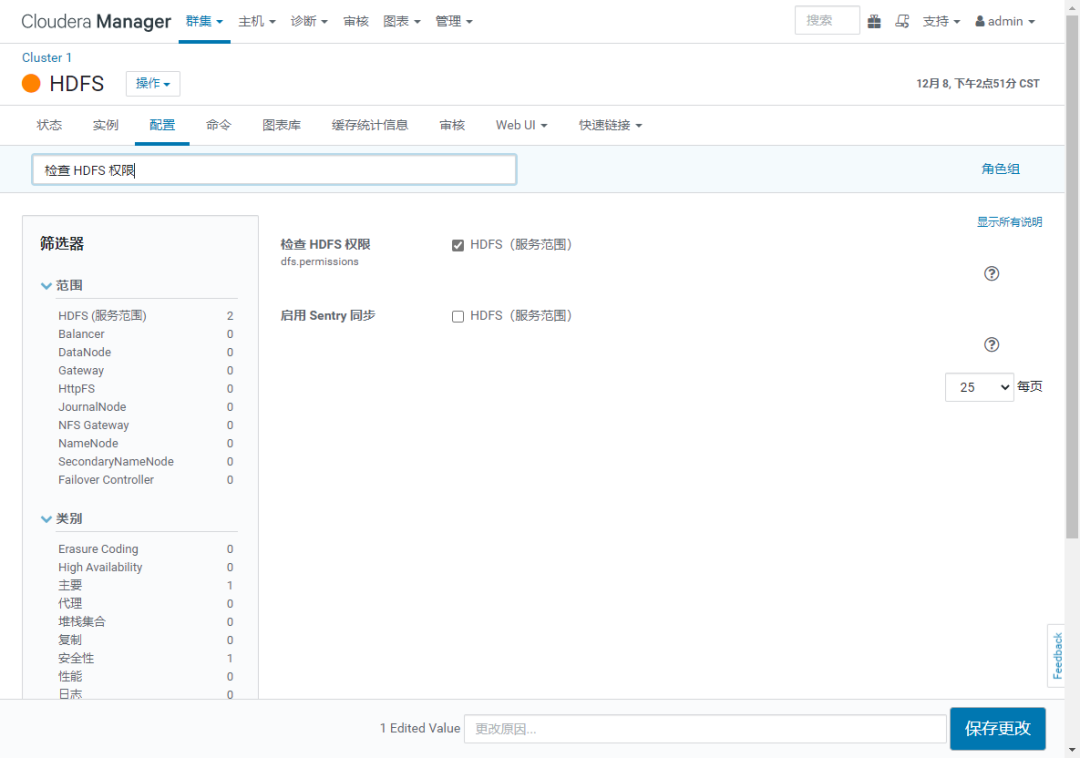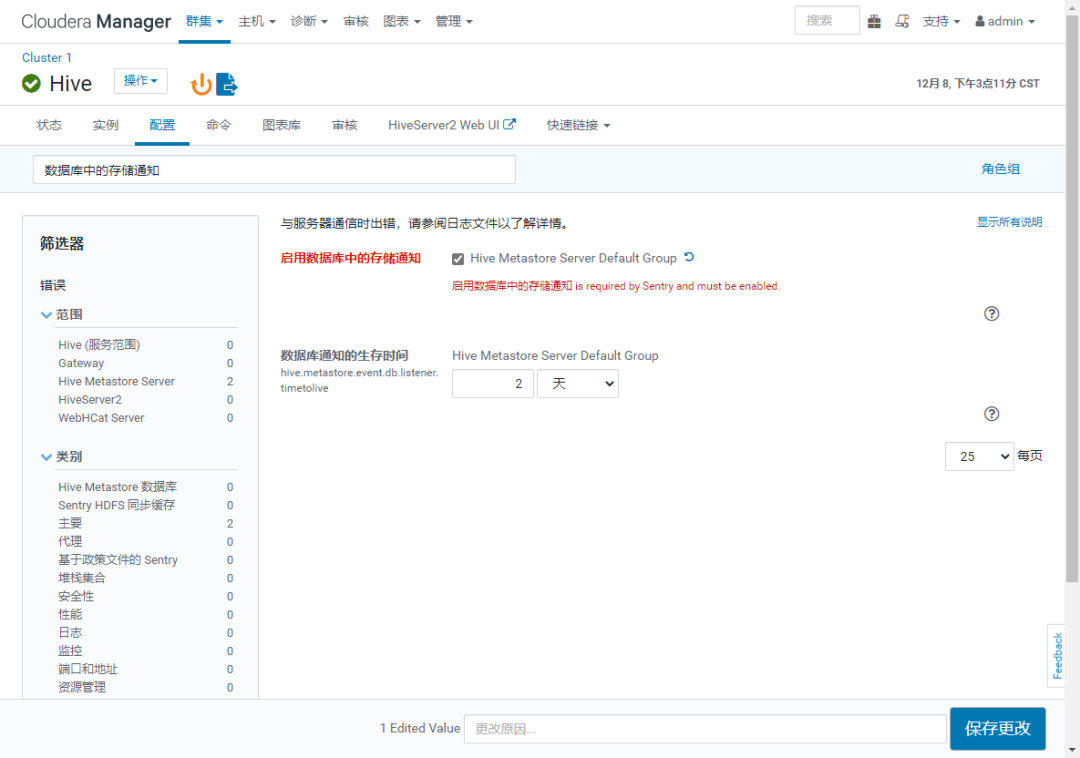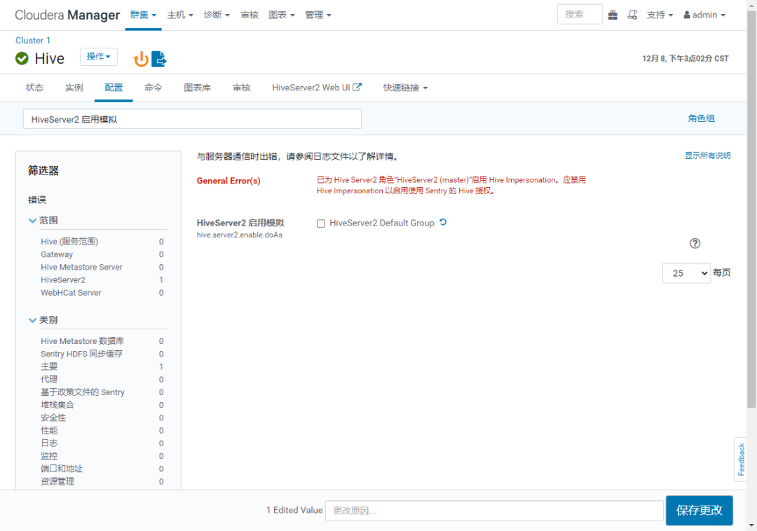如果提示 "已为 Hive Server2 角色“HiveServer2 (cdh-master-v01)”启用 Hive Impersonation。应禁用 Hive Impersonation 以启用使用 Sentry 的 Hive 授权。" 则配置 hive.server2.enable.doAs=false 并且 勾选 "Hive Metastore Server Group 1"