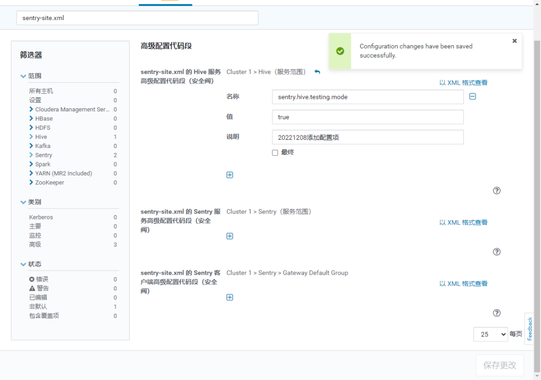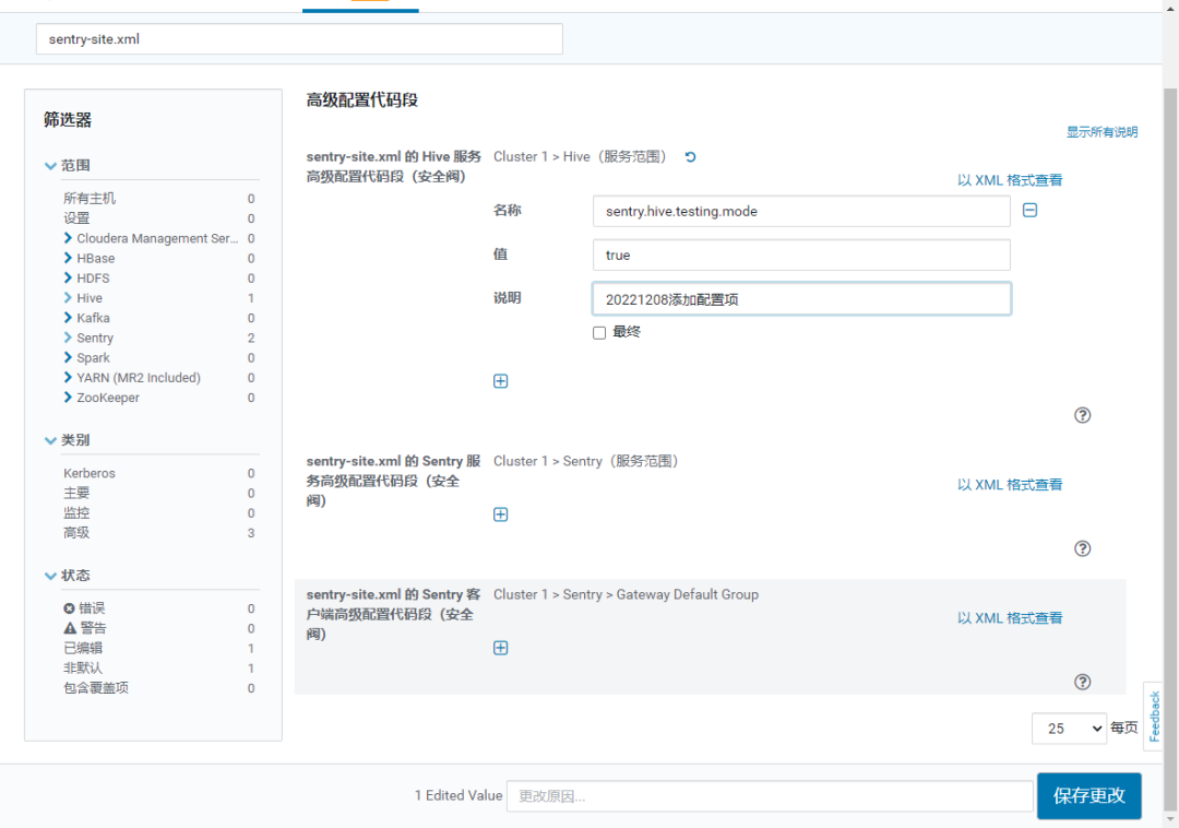 在“sentry-site.xml 的 Hive 服务高级配置代码段(安全阀)”添加一个配置