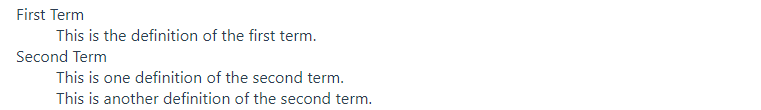 <dl><dt>First Term</dt><dd>This is the definition of the first term.</dd><dt>Second Term</dt><dd>This is one definition of the second term. </dd><dd>This is another definition of the second term.</dd></dl>