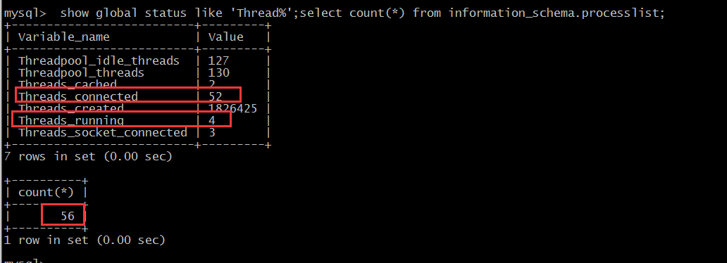 Threads_connected 跟show processlist结果相同,表示当前连接数。准确的来说,Threads_running是代表当前并发数