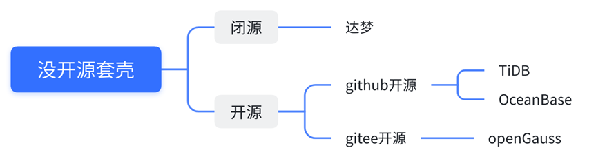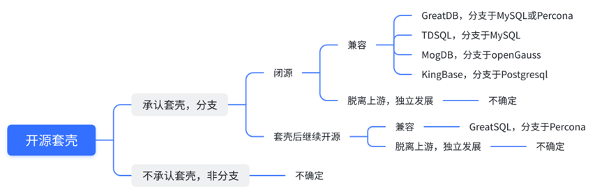 我们把上述关系模型套用到国产数据库里,我们会发现“开源套壳”里,还有一种非分支的关系。下文将为大家逐一介绍这几类分支。