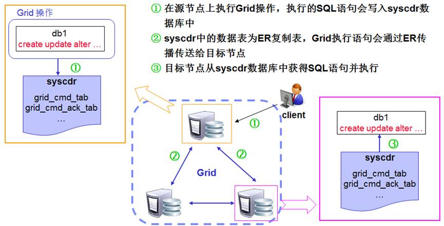 网格(Grid) 是Sinoregal DS的新特性。网格是由分布式环境中的一组服务器组成,是一个高度可扩展的多节点的高可用性解决方案。通过网格架构可以应用多个数据库服务器共同运作支撑云端数据库部署,充分发挥灵活的弹性扩展(Scale-out)。网格建立在ER(Enterprise Replication)基础之上,不仅能够复制DML语句,还提供了多节点之间复制DDL的方法。 网格支持在不同的硬件、操作系统和Sinoregal DS版本上操作。网格简单易用,具有较强的自我管理能力,通过网格可以轻松监控管理位于不同物理位置的服务器,能够极大地减轻数据库管理员的维护工作。网格的工作原理是建立在ER基础之上的,ER传播的是执行结果(逻辑日志),而Grid中传播的是执行的SQL语句。