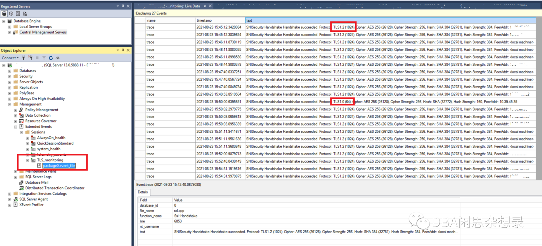 对于客户,我做了一些研究,如何找出SQL Server数据库会话连接使用了哪一种TLS协议。唯一的方式就是创建一个扩展事件,这个扩展事件有一个很大的限制就是只有SQL Server 2016或以后的版本才有。之前的版本必须使用内置诊断(BID)跟踪。