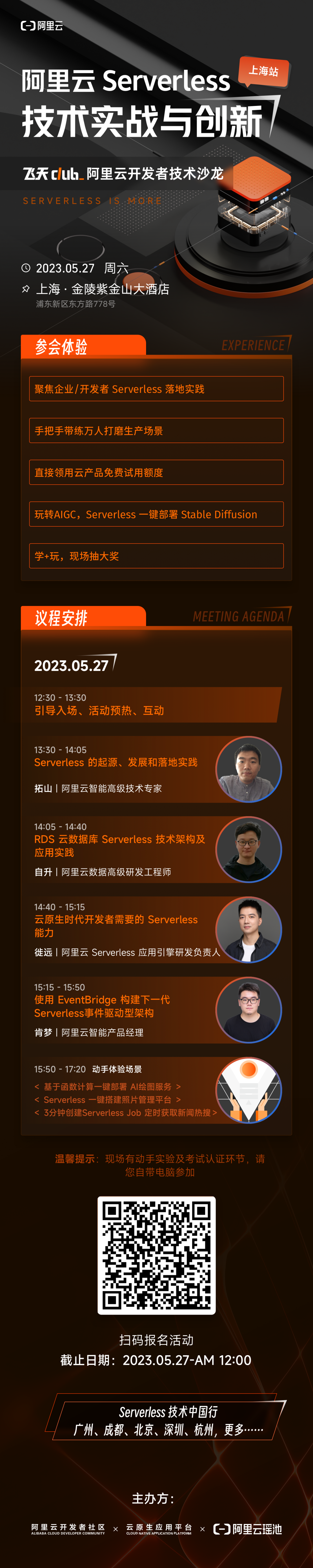 议题简介:当前 Serverless 架构从概念已经进入到大规模生产落地阶段。本议题讲由浅入深探讨企业在 All on Serverless 过程中的挑战和经验,为给更多落地 Serverless 的企业提供参考和借鉴。RDS 云数据库 Serverless 技术架构及应用实践议题简介:Serverless概念自2019年提出至今,应用层的尝试与创新络绎不绝,而数据库领域的Serverless探索则方兴未艾。传统云托管数据库,立足于Serverless,依托IaaS层的资源支持,如何为应用层带来极致的弹性、为运维带来智能化便利的体验,从而帮助客户实现真正的降本增效?本次分享,将介绍阿里云瑶池数据库RDS的 Serverless技术架构和细节,并从应用层接入的角度,介绍RDS Serverless数据库的具体实践。云原生时代开发者需要的 Serverless 能力徒远|阿里云 Serverless 应用引擎研发负责人2. 该背景下开发者为什么需要 Serverless,云原生 Serverless 的几种常见形态4. 阿里云 Serverless 商业实践和案例使用 EventBridge 构建下一代 Serverless 实践驱动型架构议题简介:本次议题内容首先介绍在实际应用中用户遇到的痛点问题,并且阐述这些痛点问题是如何通过 FaaS + BaaS 构建的事件驱动型架构去解决;其次介绍使用 EventBridge 构建 Serverless 事件驱动架构的优势,最后展示 Serverless 事件驱动架构的最佳实践及案例。3. 3分钟创建 Serverless Job 定时获取新闻热搜温馨提示:如参加动手环节,请自带笔记本电脑,及提前注册阿里云帐号。1. 聚焦企业/开发者 Serverless 落地实践4. 玩转 AIGC,Serverless 一键部署 Stable Diffusion