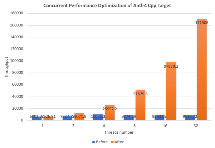 【1】antlr4 doesn't scale on a computer with 8 or more cores, https://github.com/antlr/antlr4/issues/2454【2】Parsing with C++ target 5x slower than Java, https://github.com/antlr/antlr4/issues/2584【3】Performance Issues Running Cpp Runtime on Many Threads, https://github.com/antlr/antlr4/issues/3938【4】Why the C++ target is 6X slower than the Java target, https://stackoverflow.com/questions/52528982/why-the-c-target-is-6x-slower-than-the-java-target【5】The test repo: https://github.com/wangtao9/antlr4-perfopt-test【6】Optimize the concurrent performance of Cpp target by more than 10 times, https://github.com/antlr/antlr4/pull/4237
