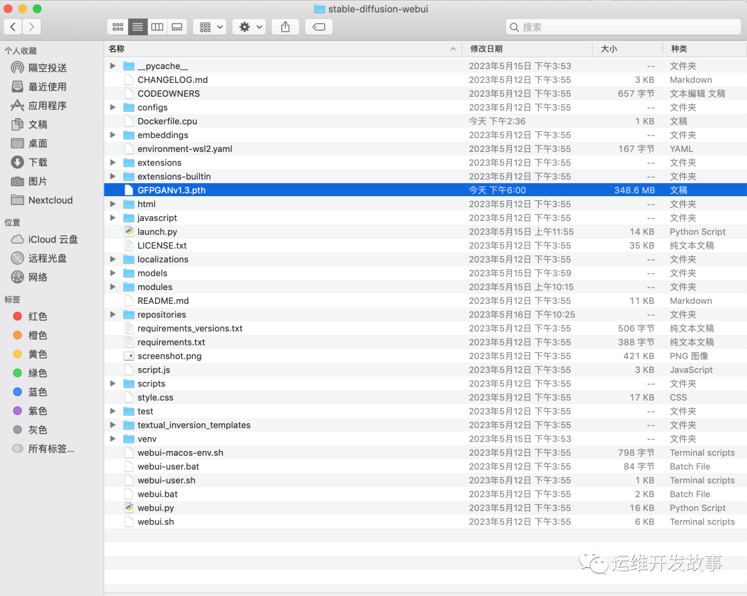 完成下载后直接将GFPGANv1.3.pth拖拽至stable-diffusion-webui文件夹中即可,如:“/Users/mac/stable-diffusion-webui/”。