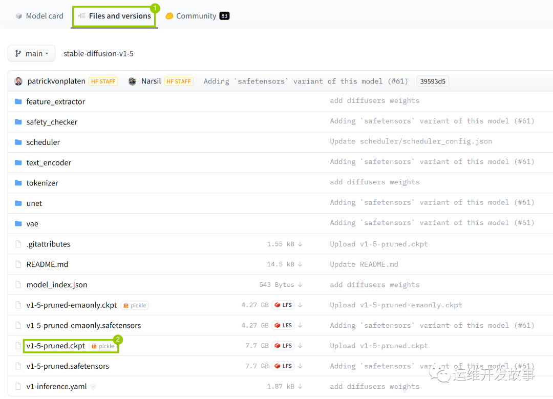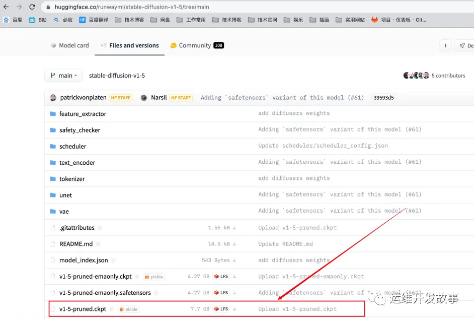 打开huggingface网站网址后切换到“Files and versions”选项卡选择如下图所示的“v1-5-pruned.ckpt”进行下载。