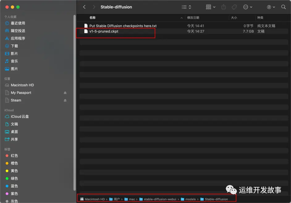 当模型文件下载完成后将此模型文件移动到“models”文件夹的“Stable-diffusion”中如:“/Users/mac/stable-diffusion-webui/models/Stable-diffusion/v1-5-pruned.ckpt”