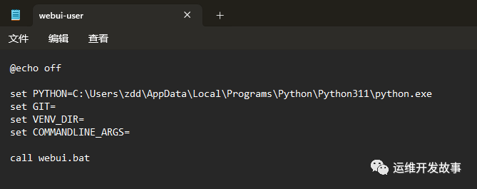 在运行webui-user.bat批处理文件之前我们首先要对其进行配置,右键该文件选择编辑即可在记事本中打开此文件开始编辑:在set PYTHON=参数后粘贴当前环境中Python.exe的路径,如:“C:\Users\zdd\AppData\Local\Programs\Python\Python311\python.exe”。