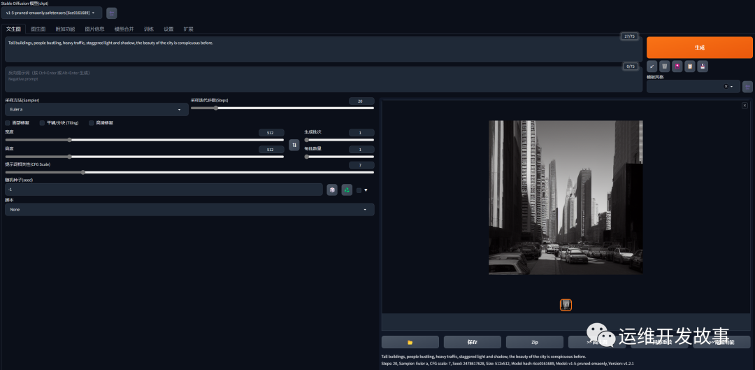 随后点击右侧Generate生成按钮即可,这里引导词的意思是:高楼林立,人群熙熙攘攘,车水马龙,光影交错,城市之美尽显眼前。