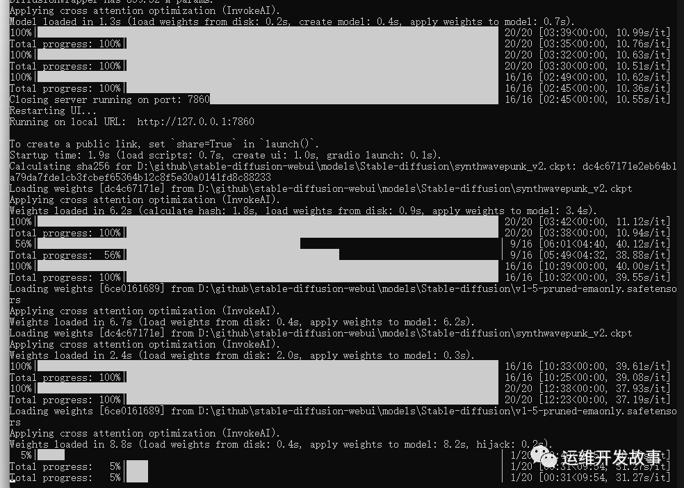 一切配置完成后再次双击运行“webui-user.bat”批处理文件即可在CMD终端窗口中自动运行,此过程可能需要一到两个小时左右,具体时间取决于你的网速