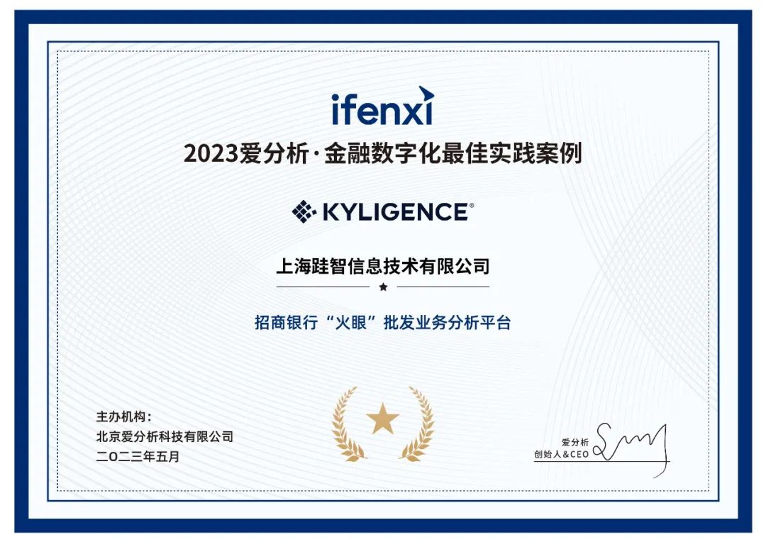 近日,“2023 爱分析·金融数字化最佳实践案例”评选结果正式揭晓。Kyligence 携手招商银行申报的“招商银行‘火眼’批发业务分析平台”项目经过领先性、案例创新性、应用成熟度、价值创造等维度综合评选,最终获评“金融数字化最佳实践案例”。