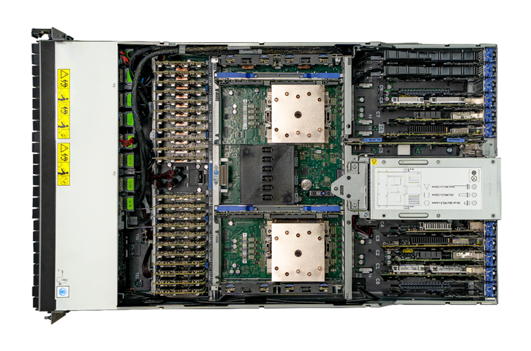K8850G3服务器内部结构浪潮K1 Power K8850G3服务器搭载的全新处理器采用了双芯片模组(DCM)设计,满配情况下4颗处理器可实现交叉全互连。每颗处理器内核最大并发运行8个独立硬件线程(SMT8),通信速率高达32GT/s,数据信号传输速率相比上一代产品提升28%,为业界之最。浪潮K1 Power K8850G3服务器采用全新设计的内存子系统,最多可支持32条4U企业级DDIMM内存模块,最高支持8TB内存容量,每双芯片模组最大内存带宽高达409GB/s,整机内存带宽高达818GB/s,内置10个支持在线维护及更换的PCIe I/O插槽,其中PCIe 5.0槽位最多可达8个,且支持外置扩展模块,是运行企业级数据库和内存数据库应用的理想平台。浪潮K1 Power K8850G3服务器支持活动内存扩展技术(Active Memory