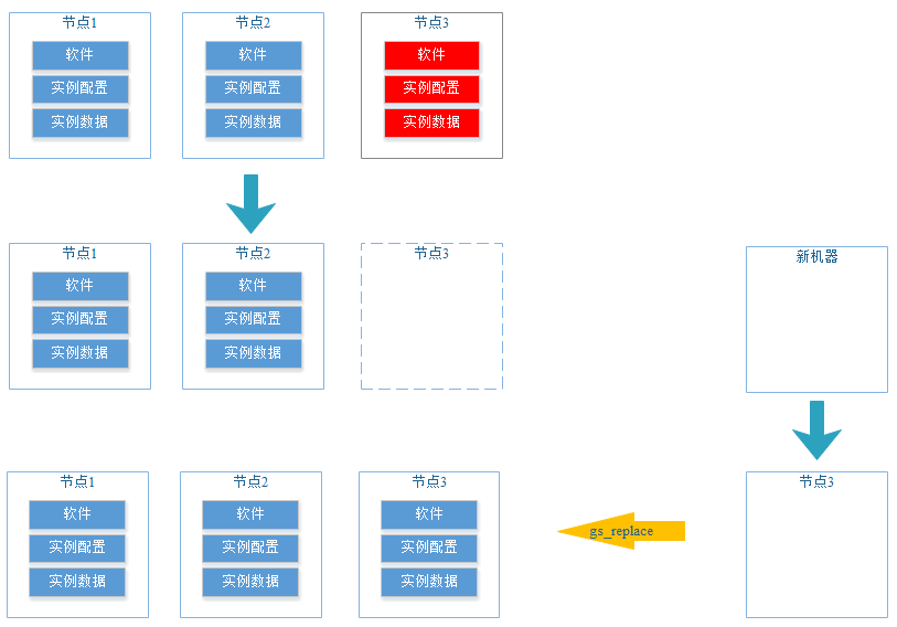 节点修复主要处理更加复杂的故障场景,该故障场景主要是指某个机器(或多台机器)发生整机故障,如CPU、内存故障,OS系统损坏导致的机器无法启动。