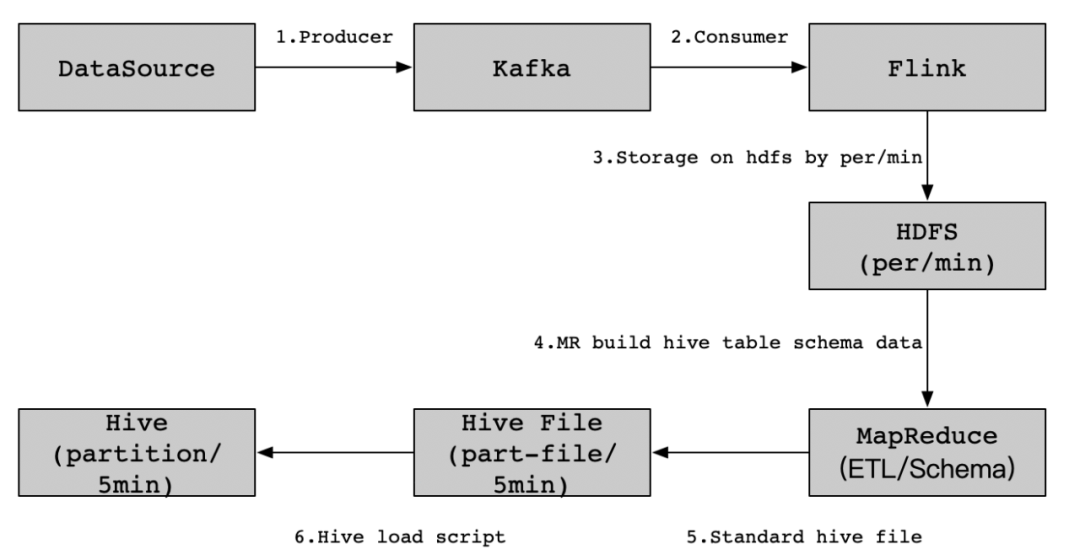 在一些特殊的场景下,Flink SQL如果无法实现我们复杂的业务需求,那么我们可以考虑使用Flink DataStream写Hive这种实现方案。比如如下业务场景,现在需要实现这样一个业务需求,内容方将实时数据写入到Kafka消息队列中,然后由数据侧通过Flink任务消费内容方提供的数据源,接着对消费的数据进行分流处理(这里的步骤和Flink SQL写Hive的步骤类似),每分钟进行存储到HDFS(MapReduce任务需要计算和重跑HDFS数据),然后通过MapReduce任务将HDFS上的这些日志数据生成Hive所需要格式,最后将这些Hive格式数据文件加载到Hive表中。实现Kafka数据到Hive的即席分析功能,具体实现流程细节如下图所示: