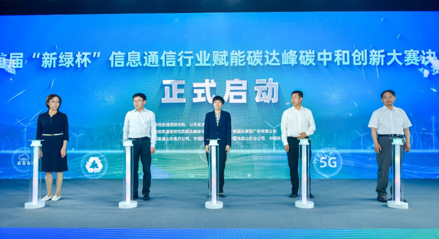 在总决赛开赛仪式上,工业和信息化部信息通信发展司二级巡视员黄先琼、山东省通信管理局局长张洪溢、中国信通院党委书记宋灵恩、工业和信息化部信息通信发展司原一级巡视员陈家春、北京市通信管理局原一级巡视员祝军共同启动首届“新绿杯”信息通信行业赋能碳达峰碳中和创新大赛总决赛。